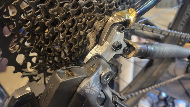 本来ディレイラーハンガーが無い車体に、諸事情で変速機を付けたくなったので、無理やり作ったりなども・・・。(こちらはリスクが大きいのをわかって自分で使っているものですのでおススメはしません。)